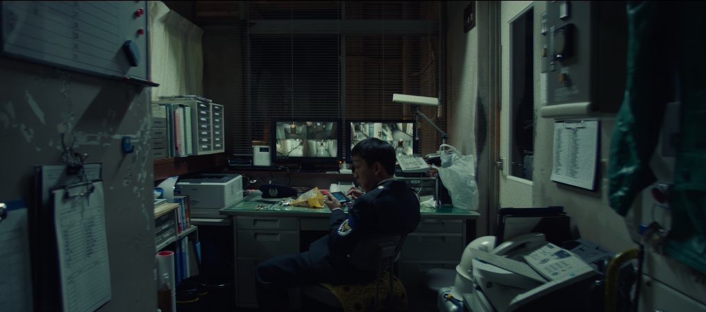 CCTV 앞에서 휴대폰을 보고 있는 경비직원, 소리를 듣고 위를 쳐다본다.