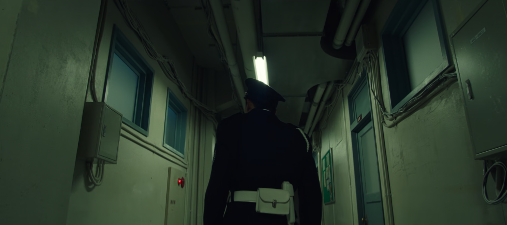 쿠도가 있는 환풍구 통로 밑 복도에서 주변을 수색하는 경비직원.