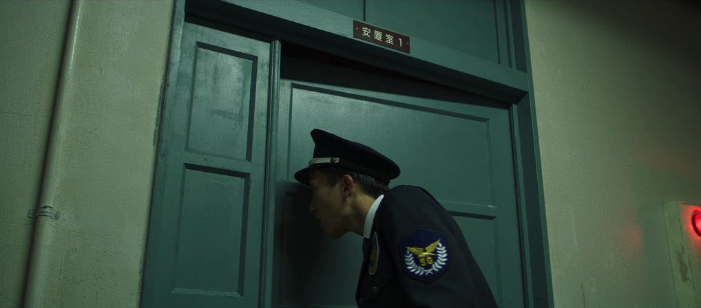 복도에서 쿠도의 소리를 듣고 안치실 쪽을 쳐다보는 경비직원.